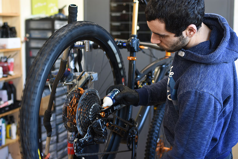 Une fois chaque composant de la transmission bien nettoyé, il est temps de lubrifier la chaîne, les galets du dérailleur arrière ainsi que les articulations des deux dérailleurs.